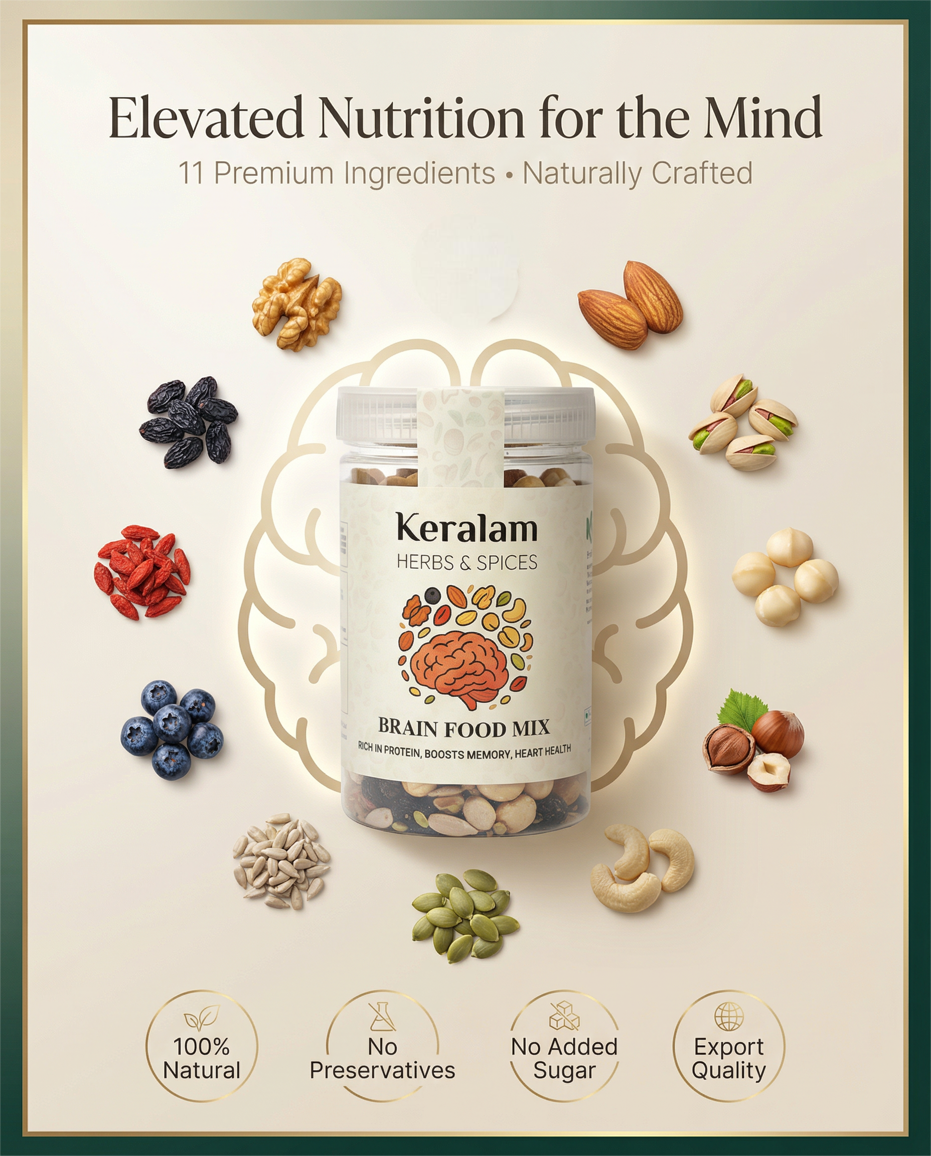 Boost your brain power naturally with Keralam Brain Food Mix, a wholesome blend of nuts, seeds, and berries crafted to enhance memory, focus, and mental clarity. This mix delivers nature’s best nutrition for your mind.